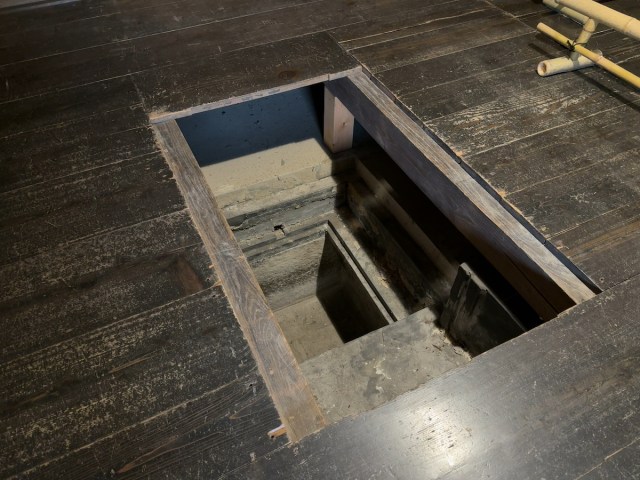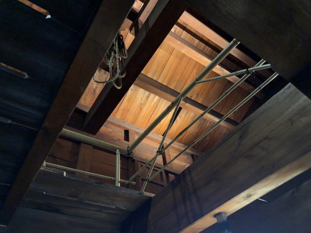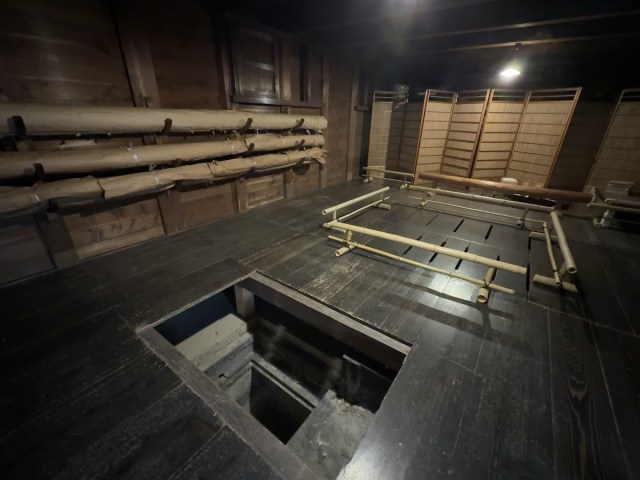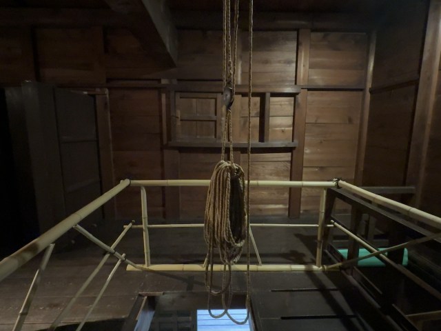 If you go up to the second floor, you can get a good look at the ropes hanging from the beams, taking you right back to the pivotal moment that led to the Ikedaya Incident. The building’s structure, with an open ceiling all the way to the basement, and sturdy ropes to carry heavy cases up and down, suggests this would have been a convenient place for the Shinsengumi to conduct brutal interrogations.