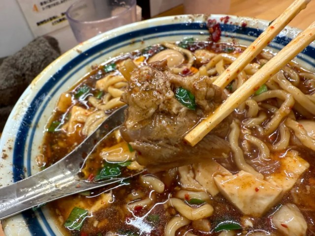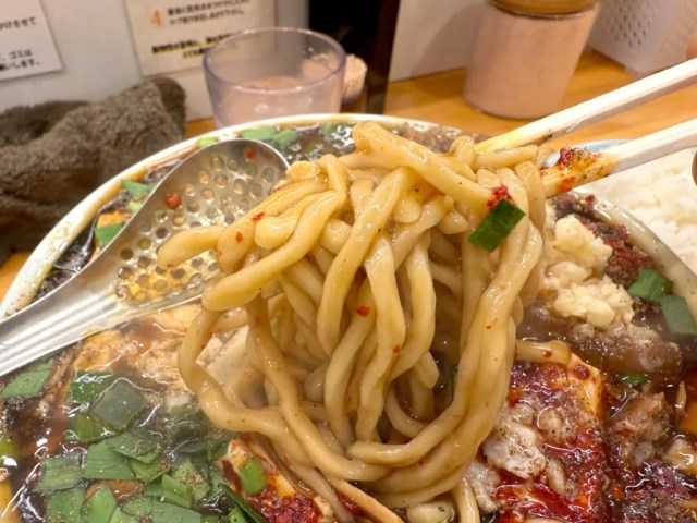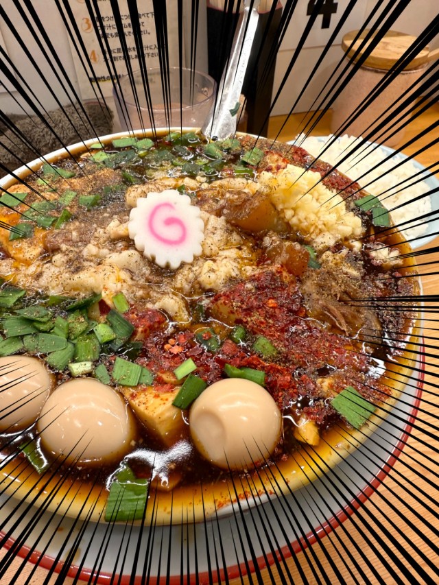 Filled so close to overflowing that it’s served with a plate underneath it to catch any runoff, the Umakarashibimen’s toppings include garlic, chili pepper, tofu, beef tendon, leeks, quail eggs, and a single naruto fish cake. There’s so much stuff floating in the broth that, when it’s placed before you, you can’t see so much as a single noodle.