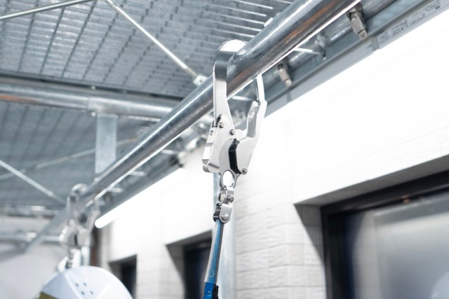 The first task is to repair the exterior wall panels. When they reach the worksite, they must clip their harnesses onto a ceiling rod for safety purposes.
