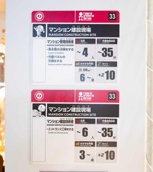 The new Mansion Construction Site (“mansion” in Japanese refers to a multi-story apartment building) is a faithful representation of an actual construction site complete with full-scale scaffolding and equipment. It’s also three stories tall, making it unusually high for most buildings at KidZania. There are three activities for kids to try in this zone: constructing the entrance as a construction engineer (recommended for ages three and up), and inspecting the drainpipes and replacing the exterior wall panels as a maintenance engineer (recommended for ages six and up). As the latter two activities require kids to be hoisted on a harness to the second and third stories, there’s also a 120-centimeter (47.2-inch) minimum height requirement. Each task takes approximately 35 minutes to complete and pays 10 kidZos.