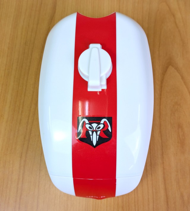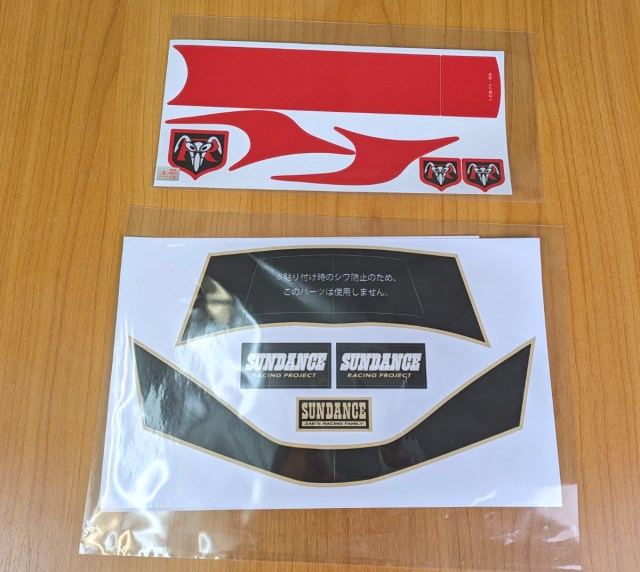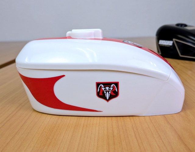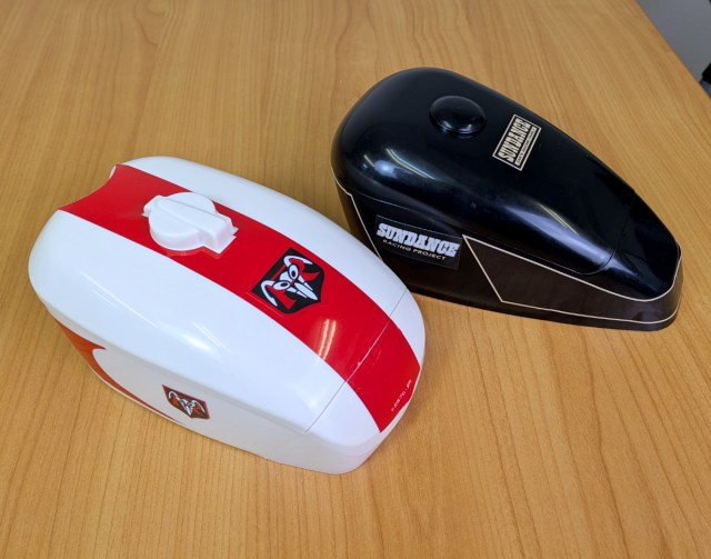 Here are the two designs that we opted for–the red and white Kamen Rider Cyclone one, and the black and white Sundance one.