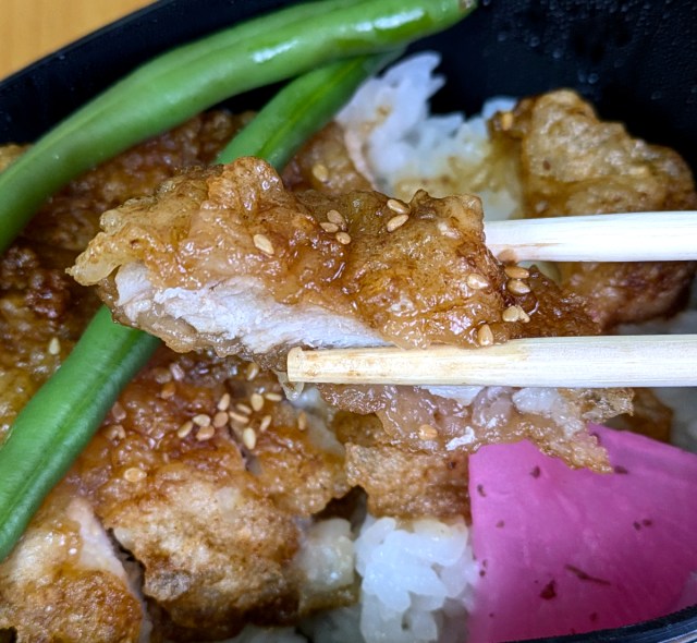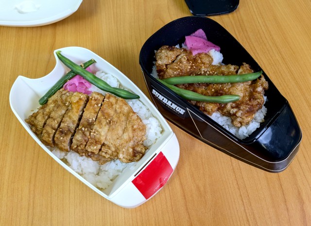 Both of them held pork, rice, a couple of green beans, and Japanese-style pickles.