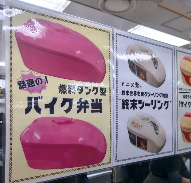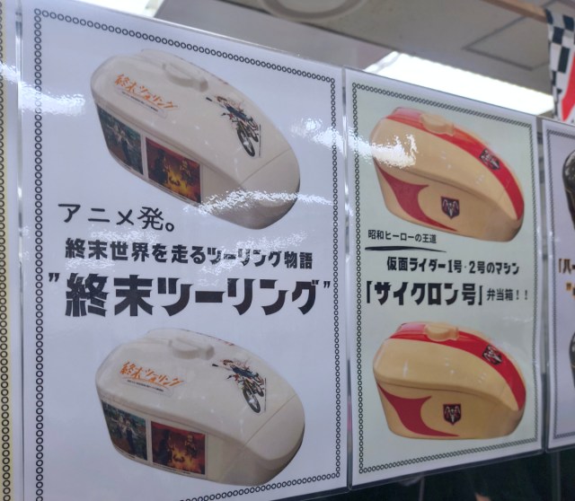 Other models came with adhesive stickers to decorate the bento box. These slightly fancier models, such as the anime-inspired Touring After the Apocalypse and Kamen Rider Cyclone ones pictured below, cost 1,700 yen.