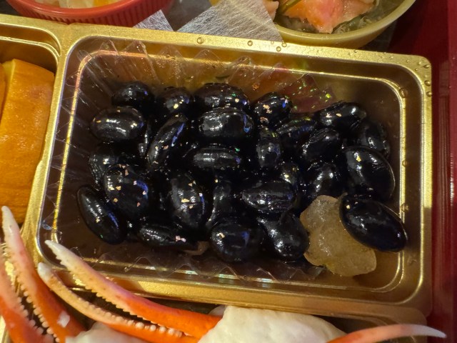 Ikuna decided to start her tasting with her usual selection of black soybeans, an important osechi standard that symbolizes prosperity. Actually, the same dish in her luxurious osechi two years ago was slightly coffee-flavored, which left lasting trauma in her mind. While that might be a fun, modern twist for certain diners, she prefers a good, old-fashioned version.