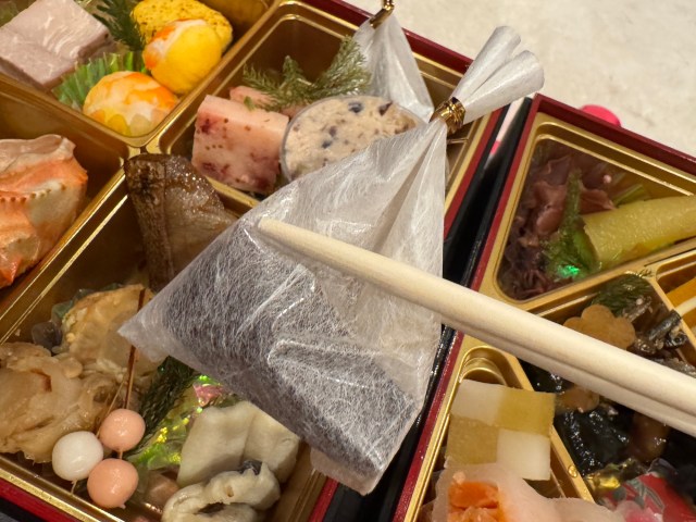 If she had to sum up this year’s osechi in one thought, it was that there were a surprising number of seafood dishes. For instance, this pouch resembling a teabag contained fish.