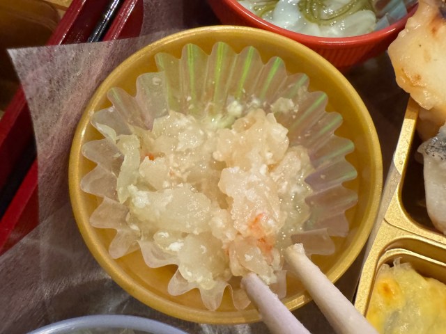 You might think that the below is tsukemono pickled vegetables, but it was actually shrimp.