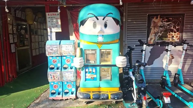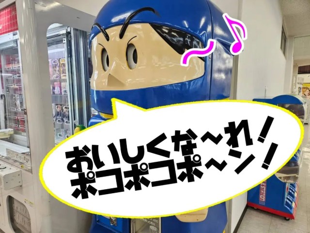 Takuya could hardly believe his eyes. While the machine he’d seen in Tokyo was exhibiting the weathering from being outside in the elements for who knows how many years, this Ninja Jajamaru was smooth and shiny. Despite having been out of production for a very long time, this unit looked practically brand-new. Even the paint on the ear of corn the ninja holds was clean and vibrant.