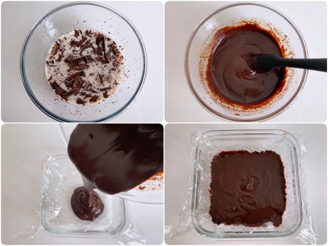Start by breaking the chocolate up into pieces and placing them in a microwave-safe bowl with the milk and mirin. Pop the bowl in the microwave for 45 seconds at 600 watts, then stir the mixture with a spatula until it’s smooth and shiny. Once that’s done, line a glass dish or other container with a bit of depth to it with plastic wrap, and pour the mixture in.
