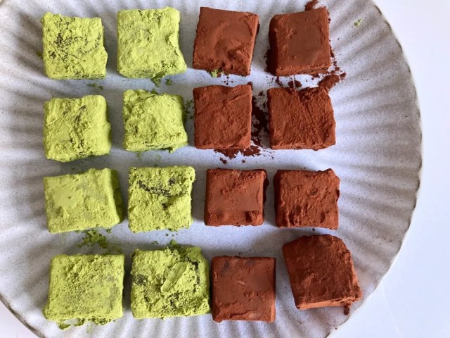 At this point, you’ve actually already got a perfectly serviceable batch of nama chocolate made, but now it’s time for the finishing touch of sprinkling on the matcha and cocoa powder.