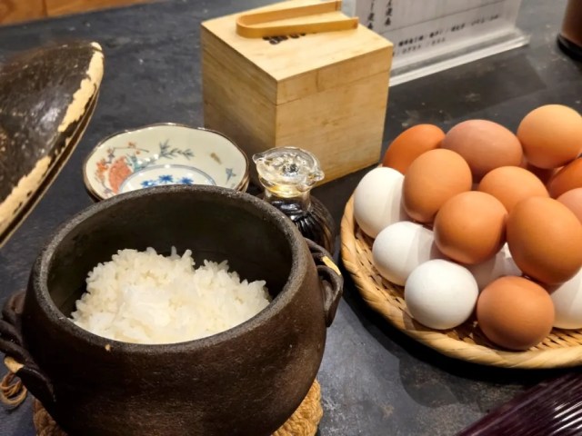 But even before our main dish came, the waitstaff served us an earthenware pot of steamed white rice, which they placed next to a plate of fresh eggs and a wooden box containing bonito flakes.