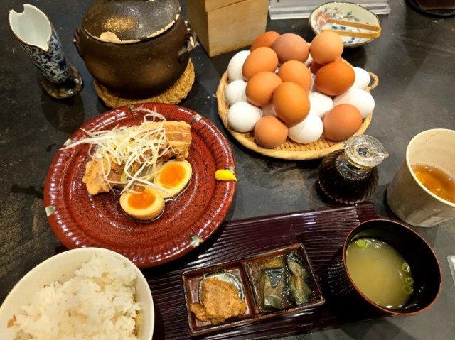 Rice and eggs aren’t all that Dashihayashi has to offer, though. There are eight different set meals to pick from, starting at a reasonable 1,200 yen (US$7.75). After mulling over our choices, which included simmered wagyu beef, sashimi, and tatsutaage fried chicken, we decided on the kakuni (braised pork belly), which is Dashihayashi’s most popular dish with customers, for 1,780 yen.