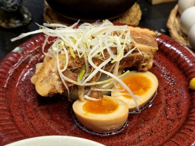 Dashihayashi’s kakuni is perched atop a slice of simmered daikon radish, with a stewed egg keeping them company on the plate. A segmented side-dish plate contained miso paste with ground pork and sliced eggplant. And of course, at any point while you’re eating, you can ask for a refill of rice, grab an egg, and make yourself some more tamagokakegohan.