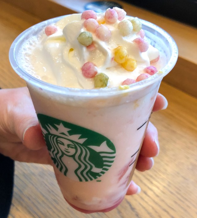 While the body of the drink looks, and tastes, similar to the Tall-sized cherry blossom Frappuccino, with white peach and sakura flavour being key ingredients, there are two major differences.