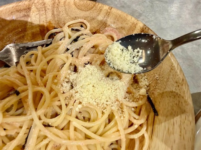 Honestly, Asami had wanted to try out the Bismarck-style Pizza, but dining alone on this occasion, it was far beyond her stomach’s capacity to withstand, so she went for the Grated Cheese Topping (100 yen) instead.