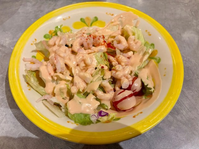 ▼ Her first recommendations for the perfect date spread are Shrimp Salad (350 yen)…