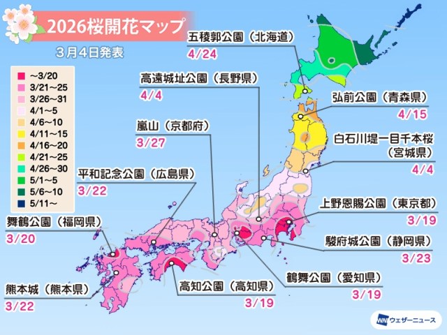 The updated forecast also includes new start-of-blossoming dates for a number of famous sightseeing spots around Japan.