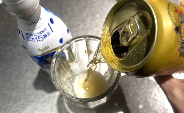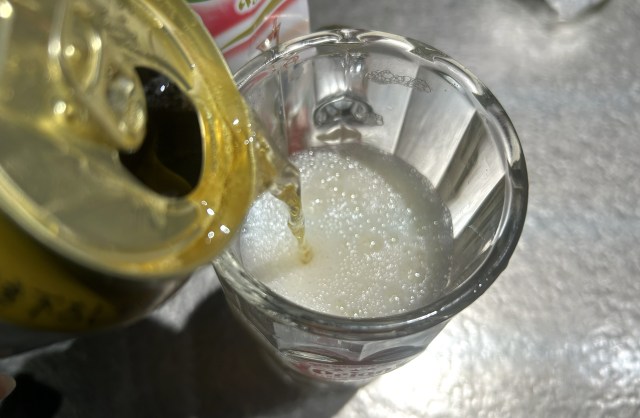When using the concentrate, the ratio of Calpis to water should be 1:4. Figuring this same ratio would work for beer, we added 87.5 millilitres (3 ounces) of Calpis to a glass and then poured a whole 350-millilitre can of beer on top of it.
