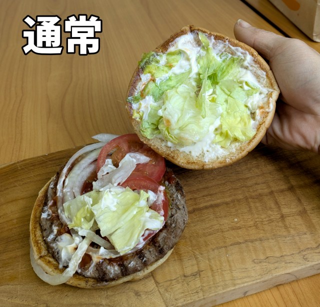This was not what we were expecting. The contents looked almost identical to the regular, and if anything perhaps there seemed to be even less inside. To be sure we weren’t imagining things, we peeled all the lettuce off the top buns and placed them on their corresponding burger patty bun for a more precise comparison.