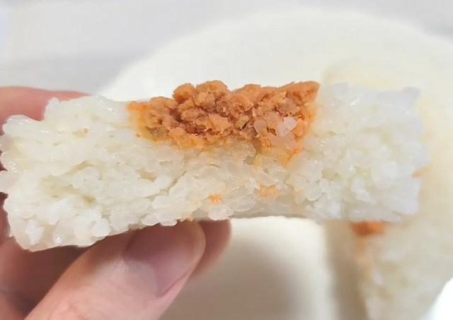 We noticed two things right away. First, these onigiri have no nori (seaweed) wrapping. Though nori isn’t something you’ll find on all onigiri, it is a pretty common ingredient, and its absence here could be considered a cost-cutting measure. On the other hand, nori isn’t really the main attraction, even among passionate onigiri fans, and the unpredictable ways the seaweed can crack or tear as you bite through it often results in little bits of it falling and making a mess, or managing to get stuck in your teeth in places where it’s practically impossible to trace the path they took to get there, and equally difficult to dislodge.