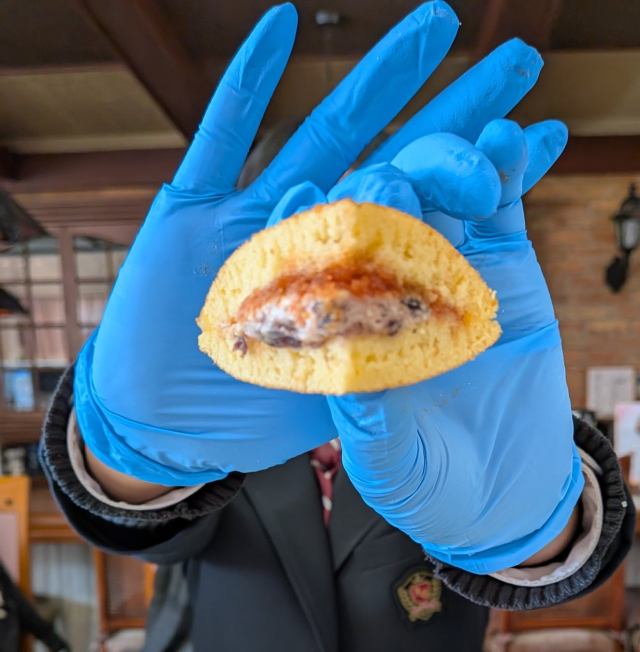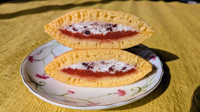 The final perfected product consists of a moist outer dough baked by the castella artisans at Sugitani Honpo filled with whipped cream, ogura-an (mashed, chunky sweet red bean paste), and Beni Tenjin syrup.