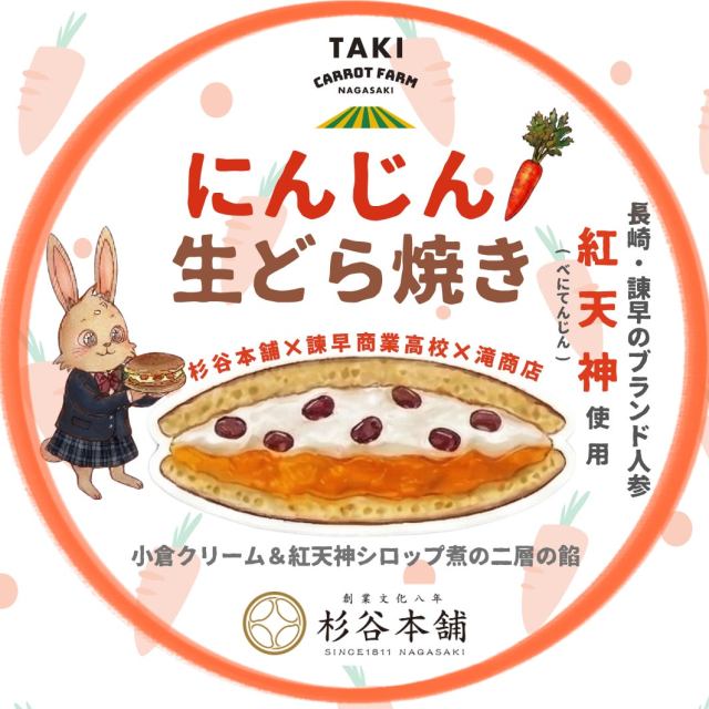 In exciting news for the now-alumni and their families, the Beni Tenjin Carrot Nama Dorayaki was officially launched for sale on April 25 and can now be purchased at Sugitani Honpo’s main storefront in Isahaya, Nagasaki. The product’s label gives a sweet nod to all three of the entities that participated in its development, including “Isahaya High School,” in text and as a cute illustration of a rabbit wearing the school’s uniform.