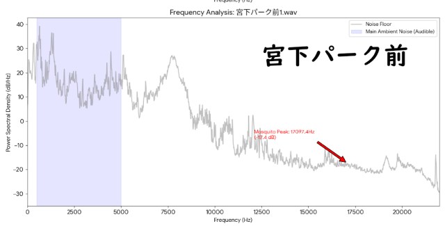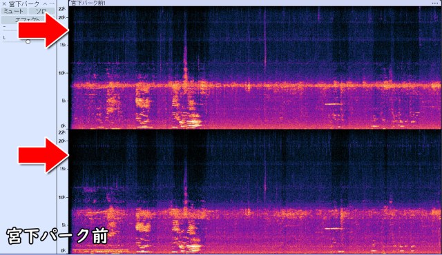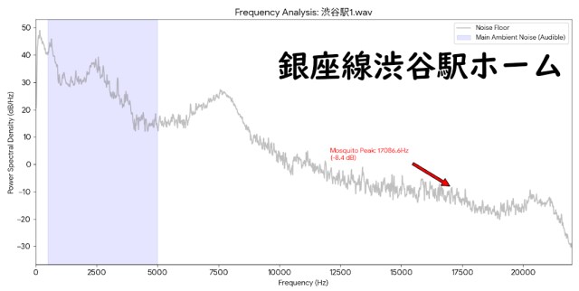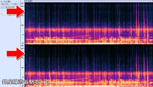 Next, in front of Miyashita Park, there are two thin lines running horizontally between 15kHz and 20kHz. This indicates that a sound of the same pitch is continuously ringing, so you should be able to hear the mosquito tone more clearly than at the Ginza Line platform.