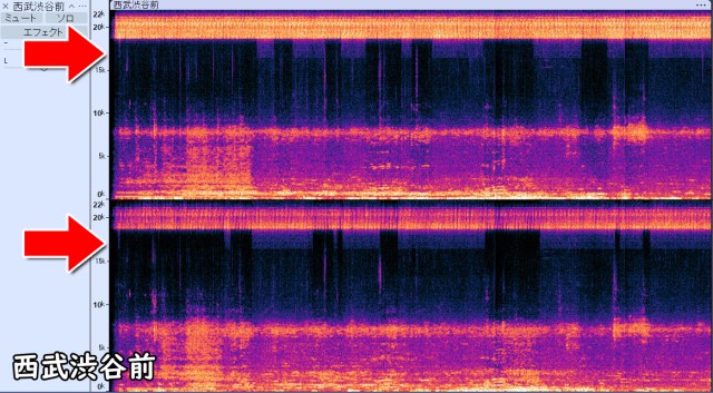 Finally, in front of Seibu Shibuya (above), a clear, thick line appeared horizontally in the 20kHz frequency band. This indicates that the sound was incomparably louder than at the previous two locations.