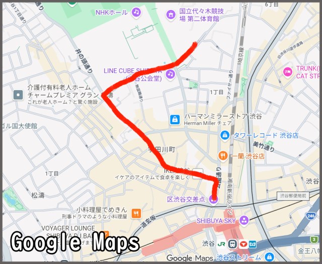 According to Mr Sato, the mosquito noise could be heard all along the route below, from Shibuya Station at the bottom through to Yoyogi National Stadium at the top.